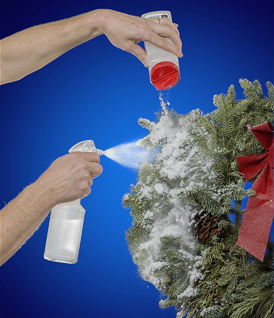 • Simply shake and spray with fine mist of water and the snow flocking will stick to any surface.